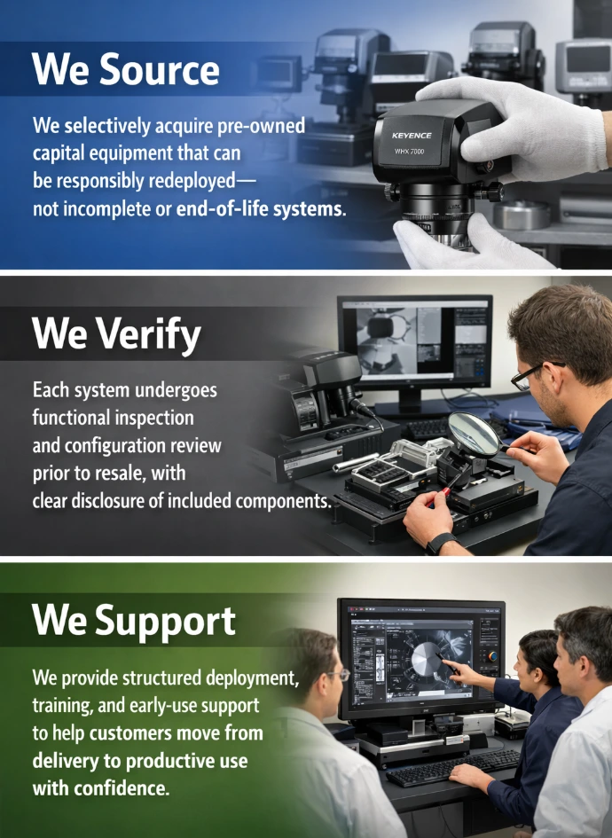 We buy, verify, and resell pre-owned capital equipment with structured deployment, training, and support services designed to reduce operational and procurement risk.
